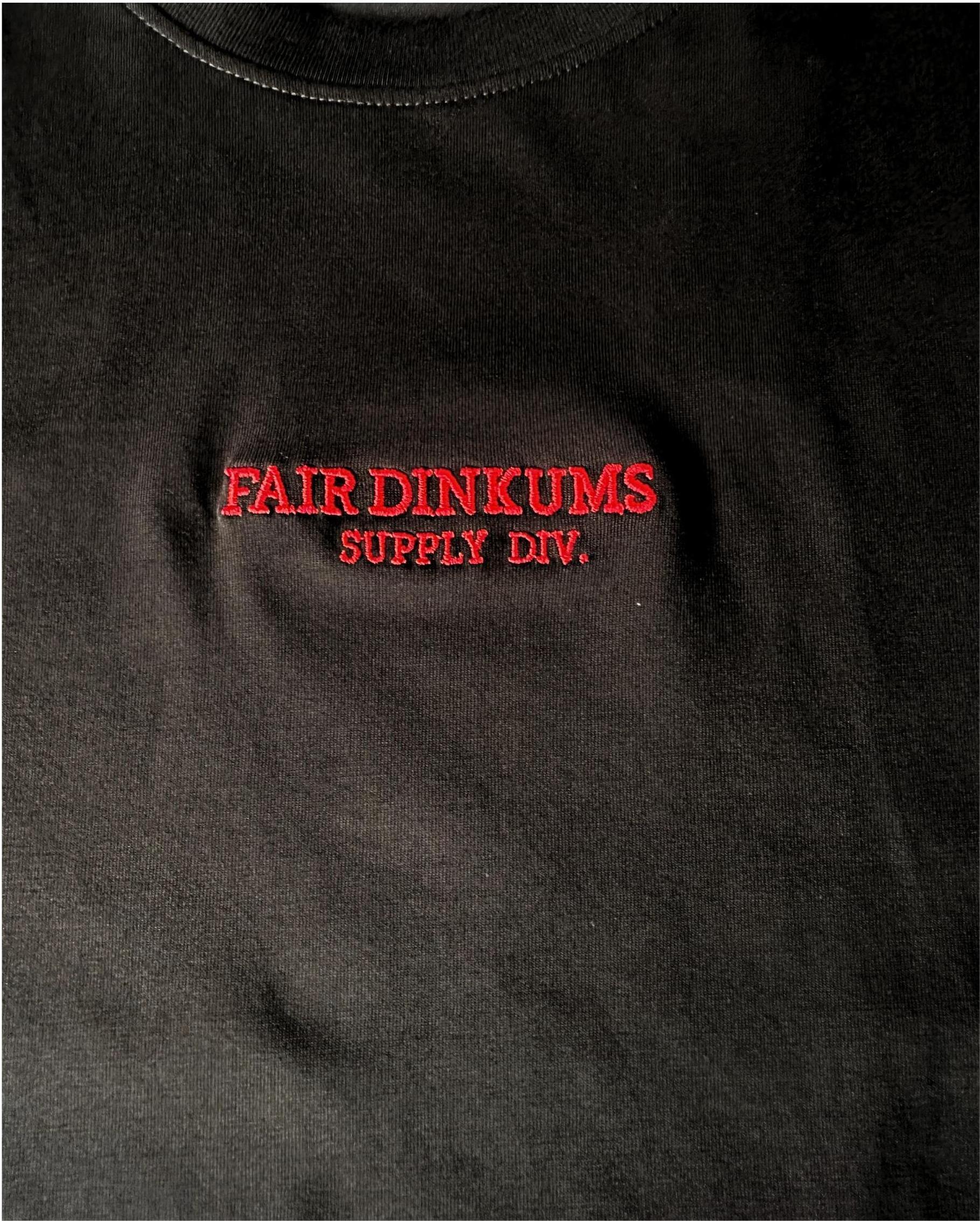 - Front Detail: Red embroidered Fair Dinkums Supply Div. chest logo