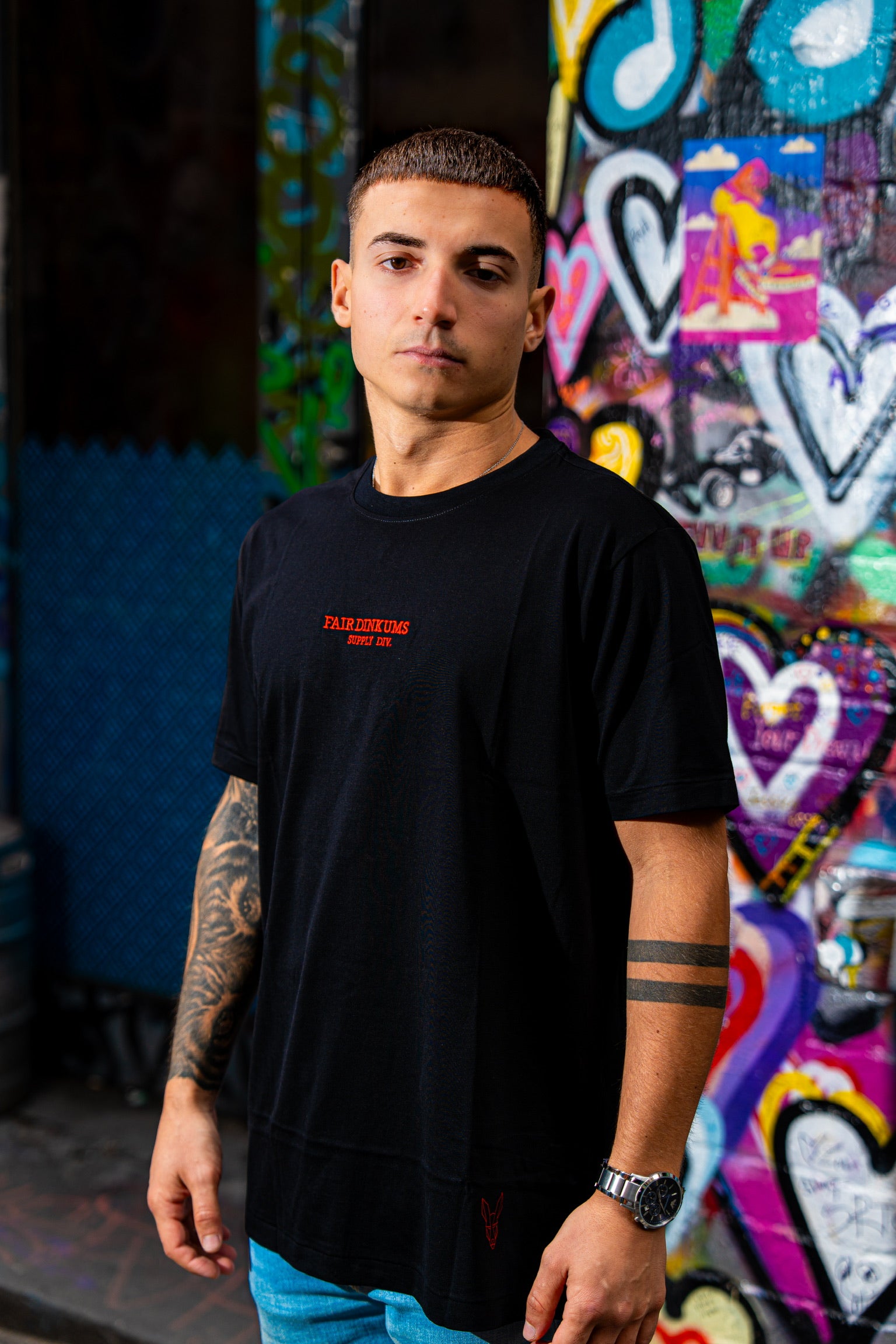 Fair Dinkums Supima Cotton Tee — Black (Red Embroidery & Hem Detail)