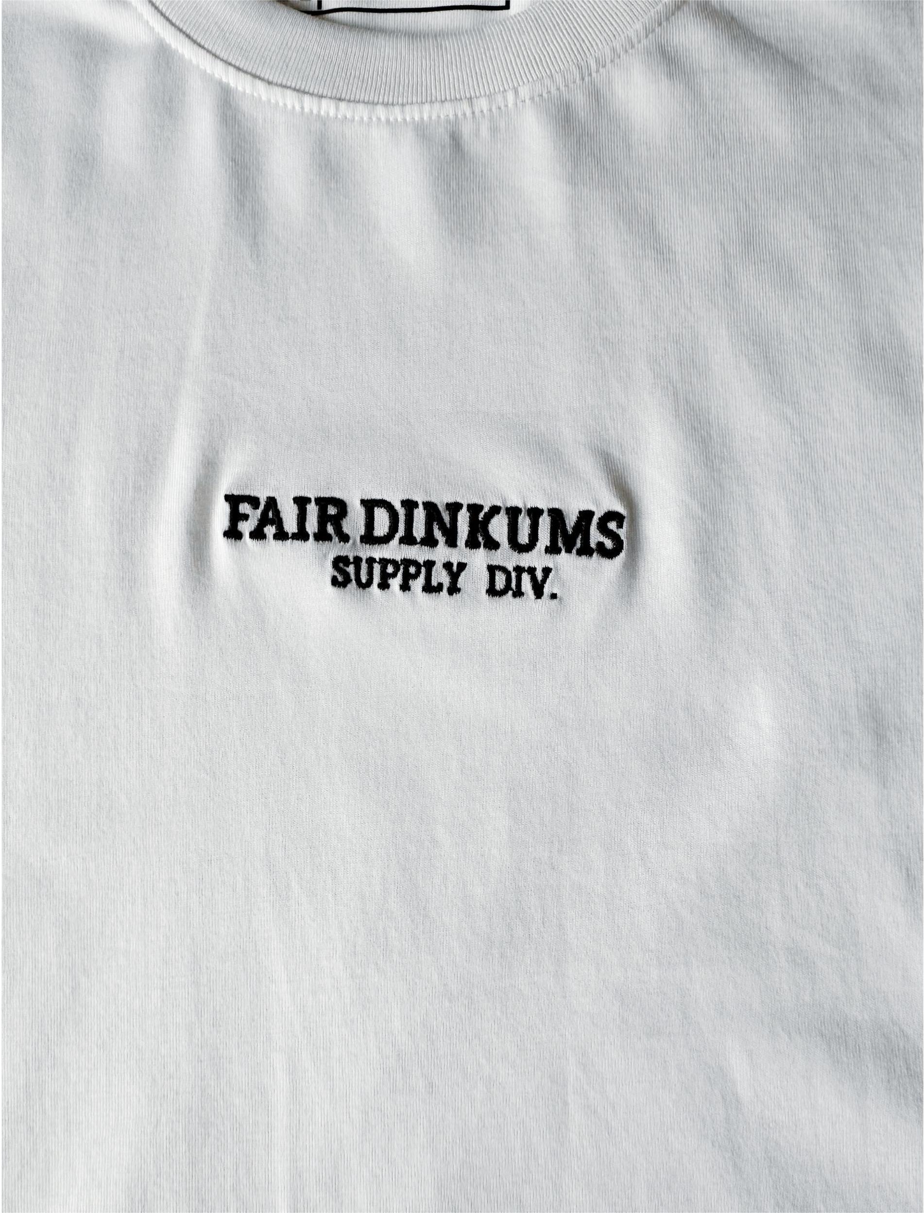 - Front Detail: Black embroidered Fair Dinkums Supply Div. chest logo