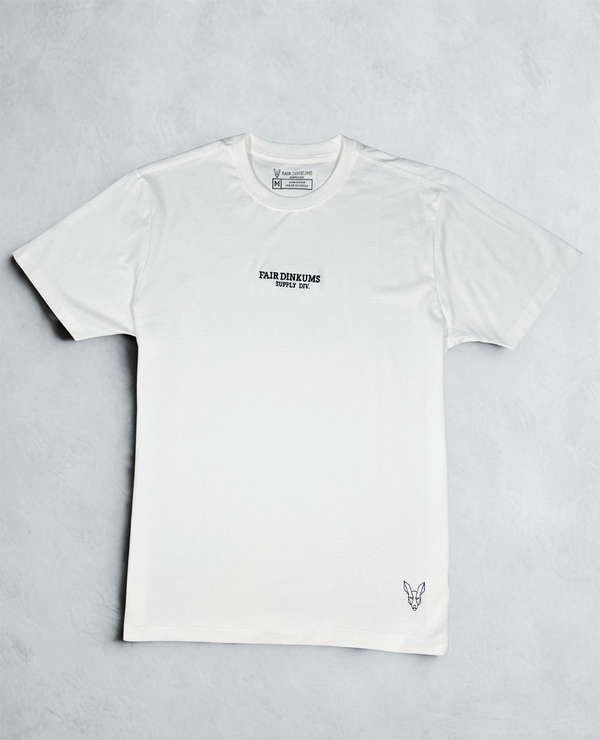 Fair Dinkums Supima Cotton Tee — White (Black Embroidery & Hem Print)