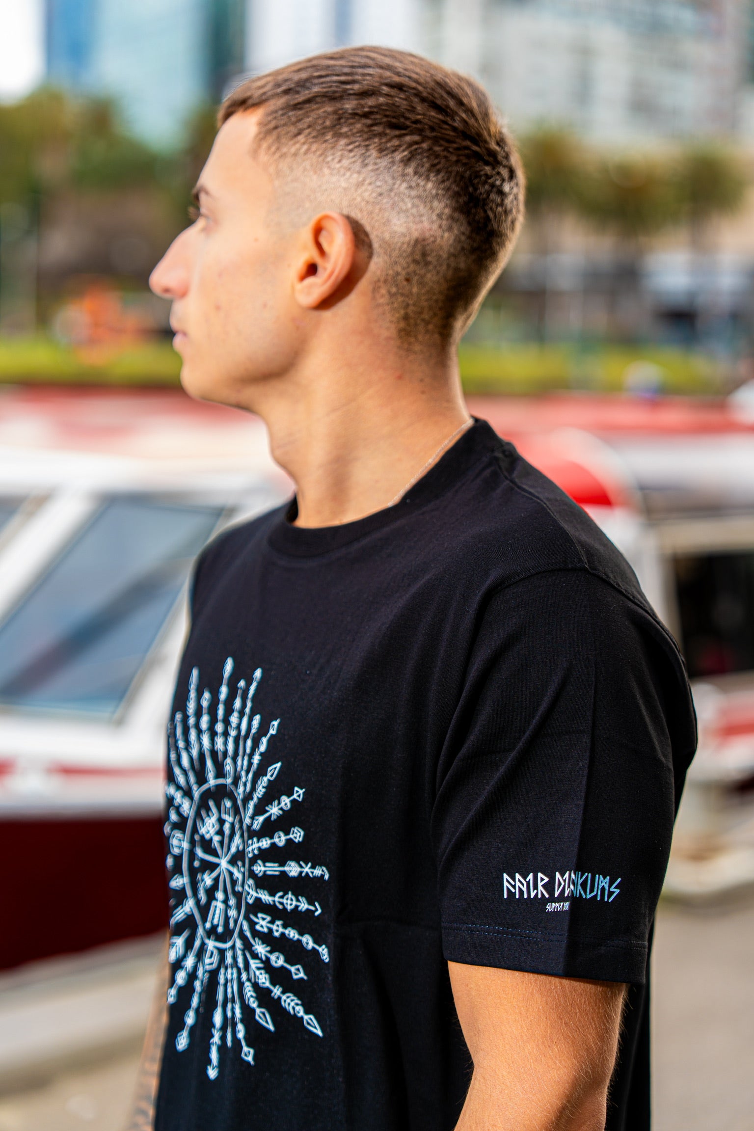 The intricate Vegvísir print sits boldly on the chest, balanced by the Fair Dinkums Supply Div. sleeve logo — minimal, iconic, and unmistakably ours.